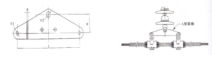 型联板用于双联耐张绝缘子串与单根导线组装、单串绝缘子与双根导线组装、双根拉线的组装、单串绝缘子双支点悬垂线夹的组装等。主要用于双支点悬垂线夹的组装,以及需要L型联板组装的地方。