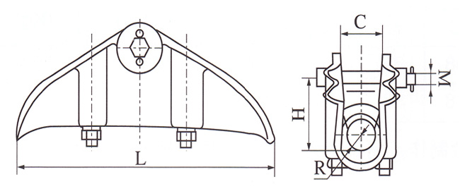 线夹本体和压板为可锻铸铁件,闭口销为不锈钢制件,其余为钢制件、可锻铸铁件和钢制件热镀锌